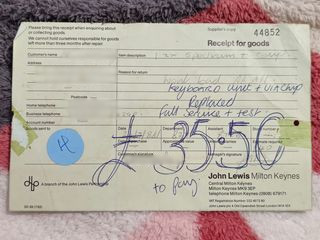 This repair receipt was in the box as well, from John Lewis in Milton Keynes. A previous owner had paid £35.50 on the 24th July 1988 to have a new keyboard unit and the ULA chip replaced