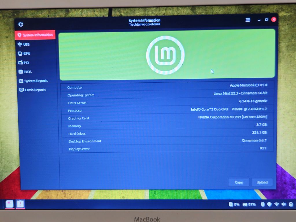 Despite using an old Core 2 Duo CPU the laptop runs Linux Mint fine, it would be even better using an SSD rather than a traditional hard disc
