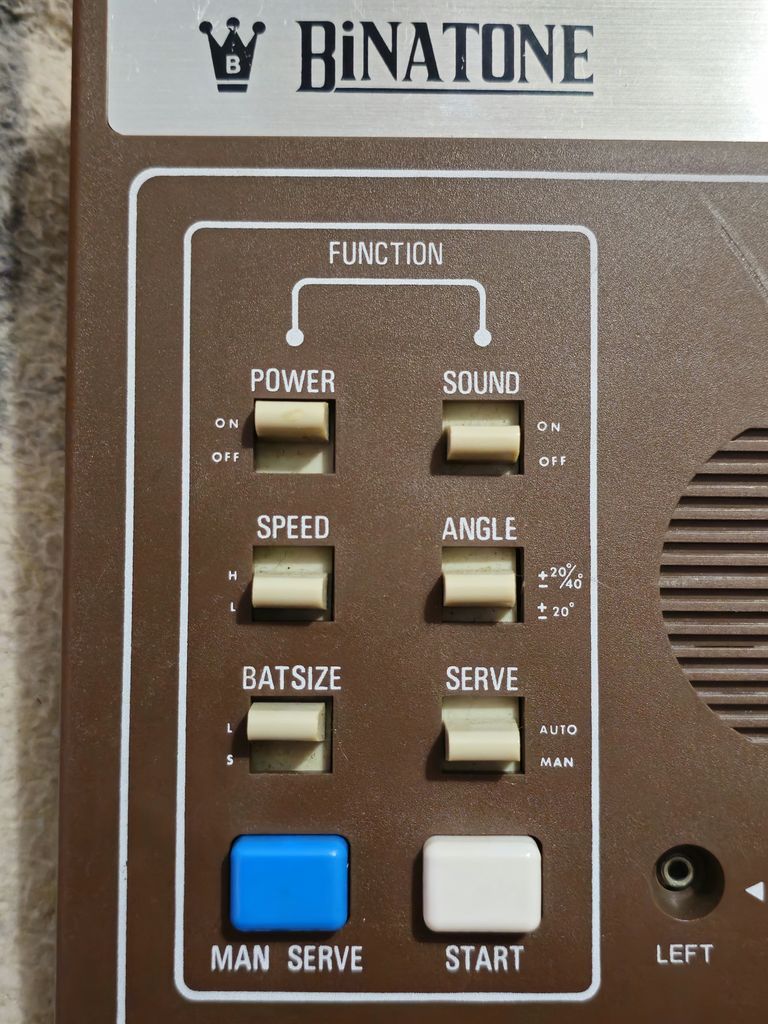 Close up of the switches which offer power and sound on/off, ball speed and return angle, player bat size, and auto manual serve. And buttons for manual serve and game start