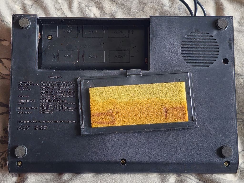 The base of the unit is typical of the brand, with embossed patent text and model label. There is also the battery compartment and speaker