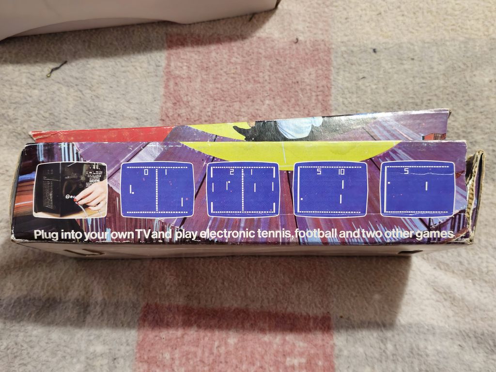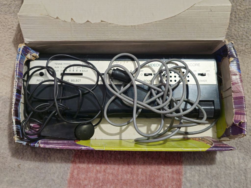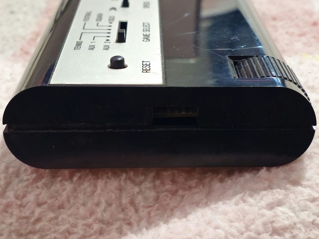 The metal plate has a golden tint to it, like a Mattel Intelivision, looks quite nice, and offers the normal array of PONG options including reset, game select with six games, ball speed and bat size, then sound on/off and power. As is common with the PONG's of the era the sound comes from the unit itself, rather than through the TV. There was no sound carrier so the TV would output white noise which made it necessary to turn the volume down. This may have been for compatibility between PAL regions which used different sound carriers but the same video standard, but more likely for cost reasons