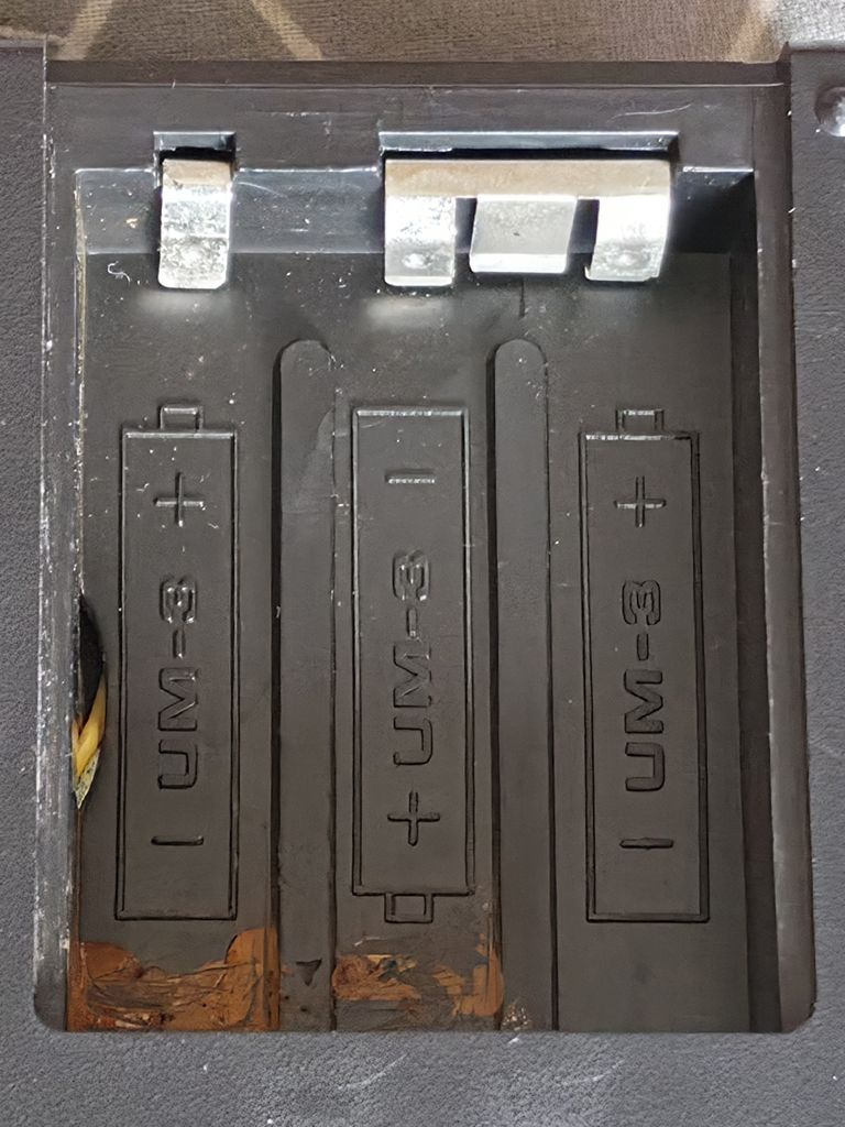 The base of the unit has the battery compartment and model label, the battery cover is missing