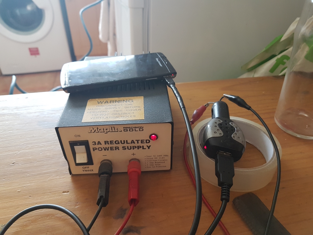 Next comes the power, the 500mA USB power pack shown in this photo worked on the bench, but failed to put out enough power while in practice, meaning the phone's battery slowly lost charge in operation, so I swapped it out for a 1000mA supply, which charged the phone just fine, but emitted a boat-load of RF interference, completely wiping out the radio signal. So a new 2400mA dual USB supply from Asda for £5 was bought...