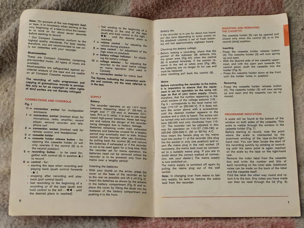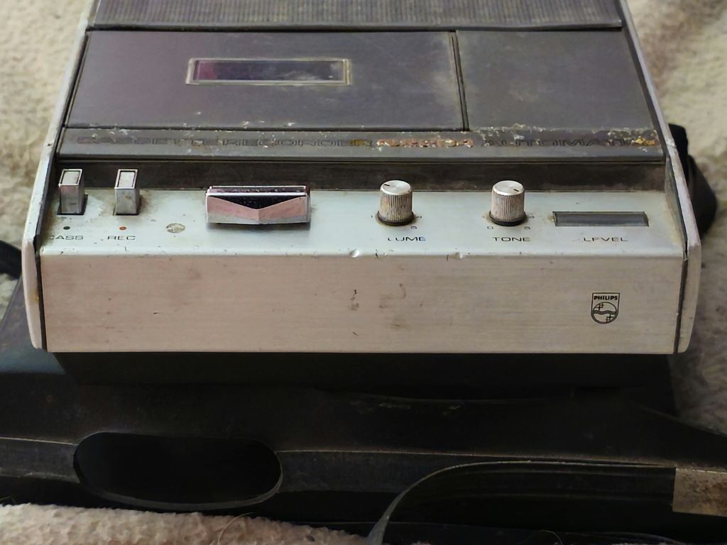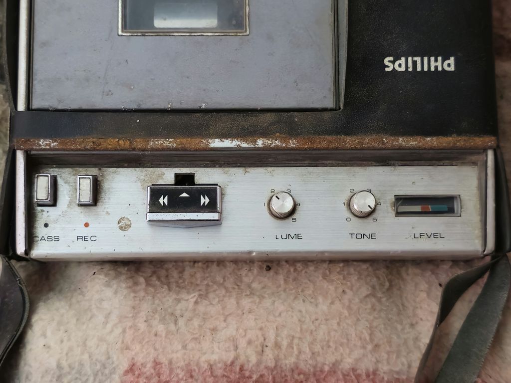 It has the old style tape transport controls rather than the typical piano keys of more modern cassette mechanisms. Also we have the Cass (Eject) and Record buttons, Volume and Tone controls, and finally the tape recording level VU meter.