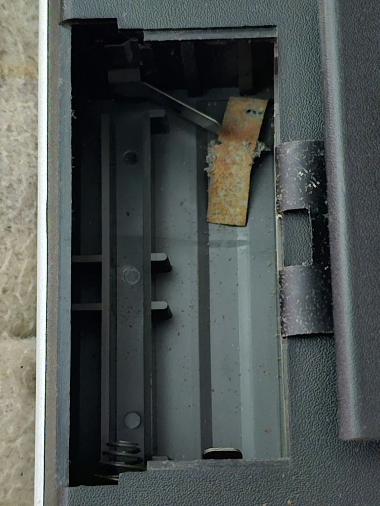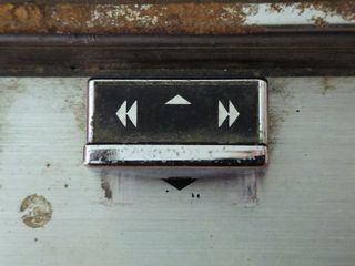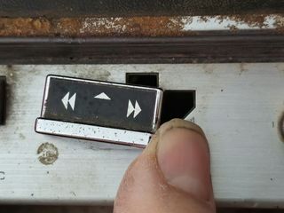 For the younger readers who haven't seen this mechanism before, you push forward to play, pull back to stop, and push and hold left to rewind, and right to fast forward. To record, press and hold the button and push the lever forwards. If the tape is write protected the record button is locked and cannot be pressed in
