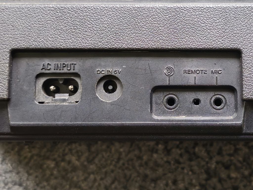 On the left side we have a choice of a Fig-8 mains input or a 6VDC barrel socket for external power, then the usual Ear, Remote, and Mic sockets for computers such as the ZX Spectrum and the TI-99/4A