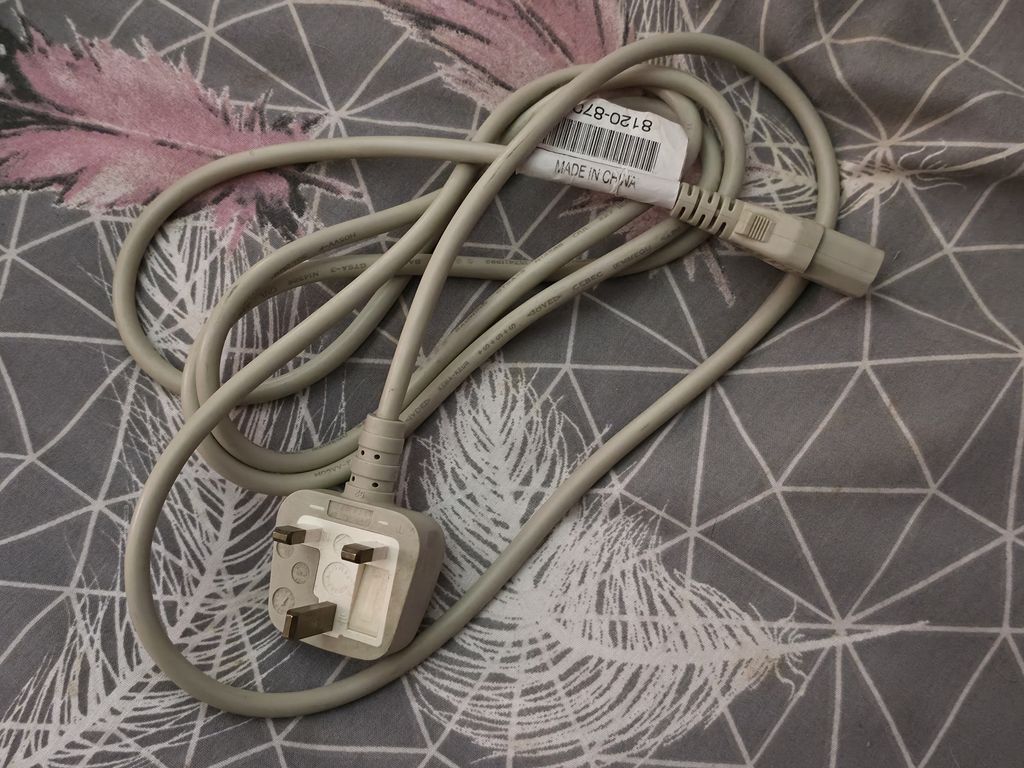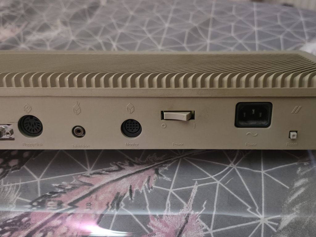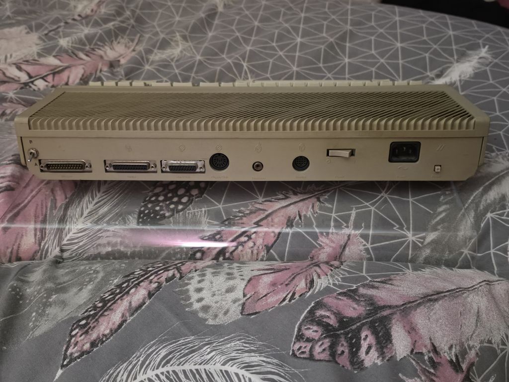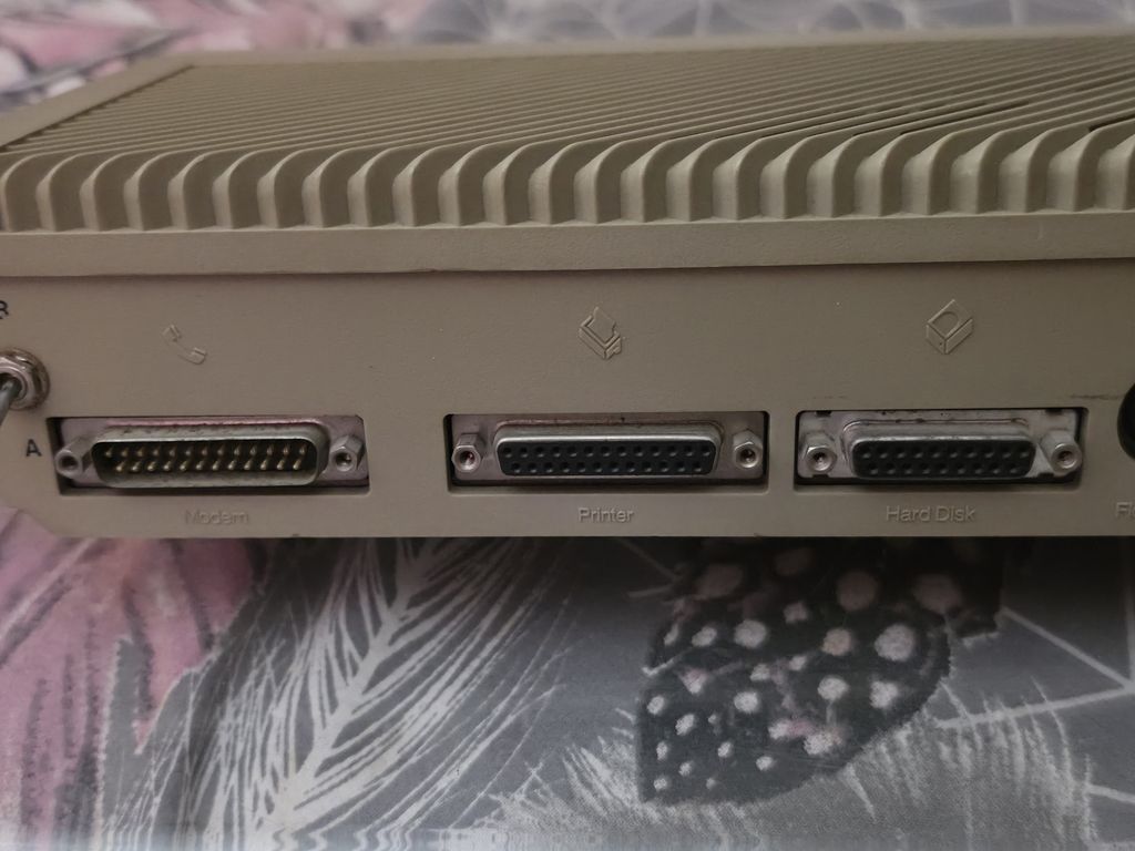 The rear of the computer has a mystery switch, and ports for a modem, printer, hard disk, second floppy disk, RF for a television, monitor, and a power switch with IEC mains socket as the power supply is built in, and finally a reset switch