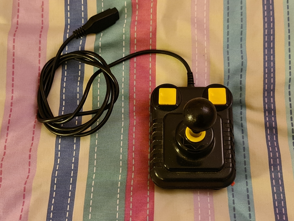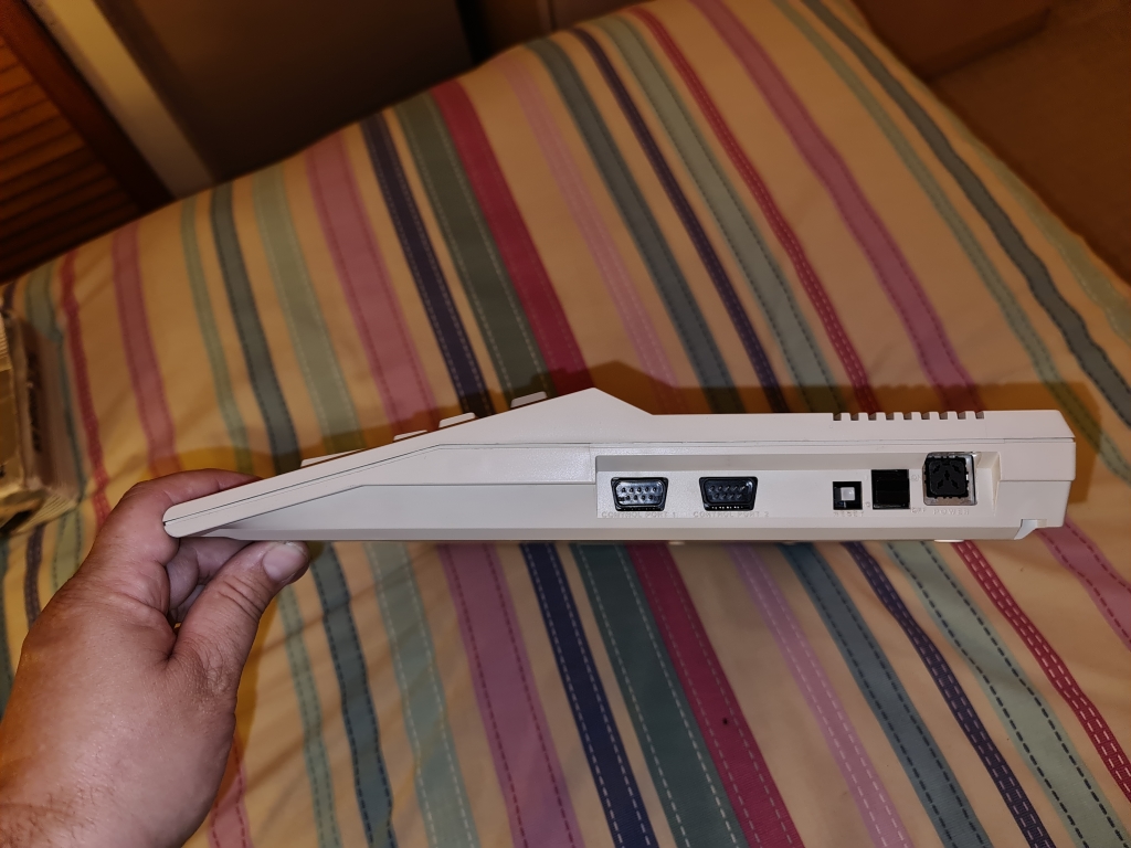 The left side of the computer is empty, while the right side contains two joystick ports, a reset button, power switch, and a power socket