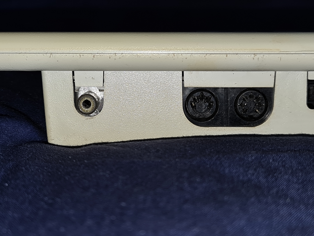 There is not much going on at the rear of the machine, an RF output, two DIN sockets, the left being for a RGB monitor, and the right for the cassette in/out. The smaller block connector is for a printer, and the larger is labelled "Bus Expansion". Then there's a cheeky little power connection next to that on the right-hand side