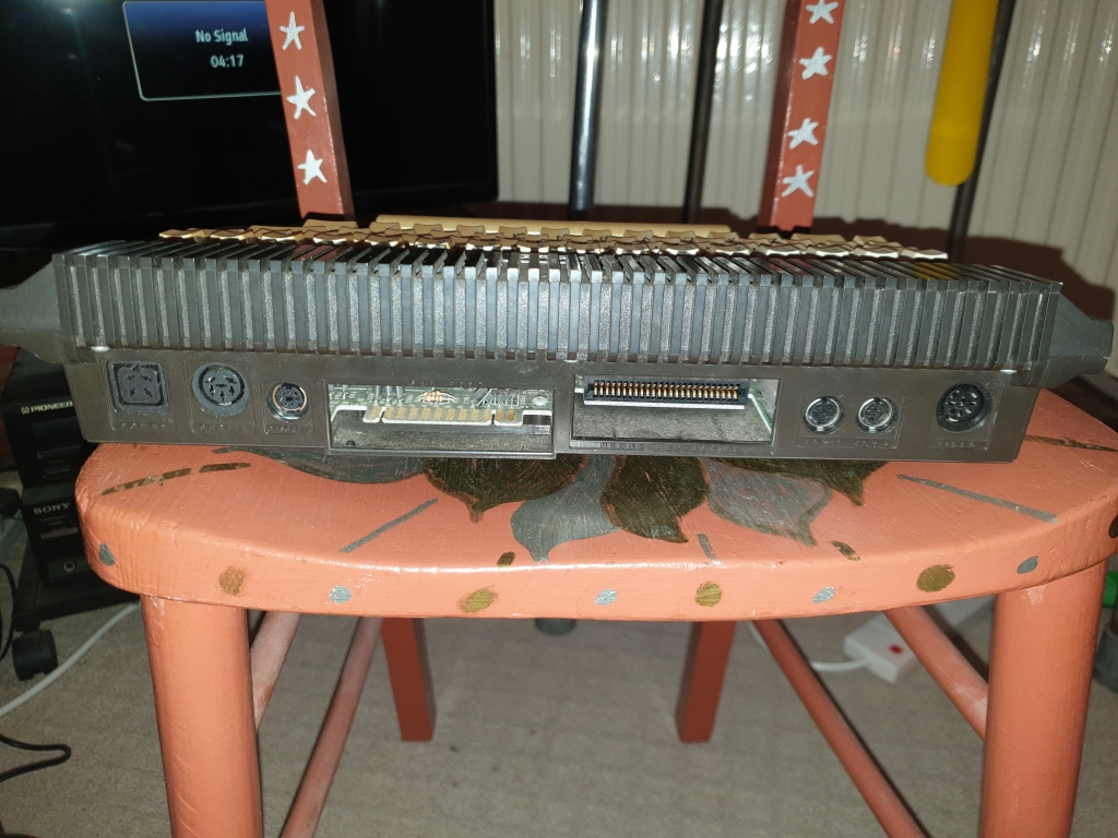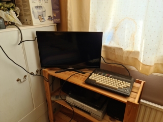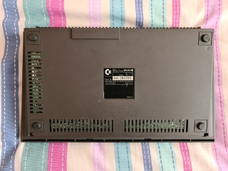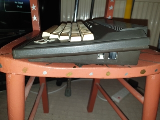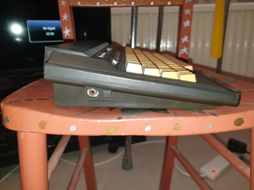 On the back (from the left) is the power socket, this is pin compatible with the Commodore C64 PSU, but has a strange square plug. Next is a Serial port, then the Cassette port, which is different to the C64, A User port and Memory expansion are next. Then there are two mini DIN joystick ports, no Atari compatible ports here, Commodore gave the reason of less RF interference for using mini DIN sockets, but you could get adaptors for normal joysticks. Then finally a Video socket for a monitor.