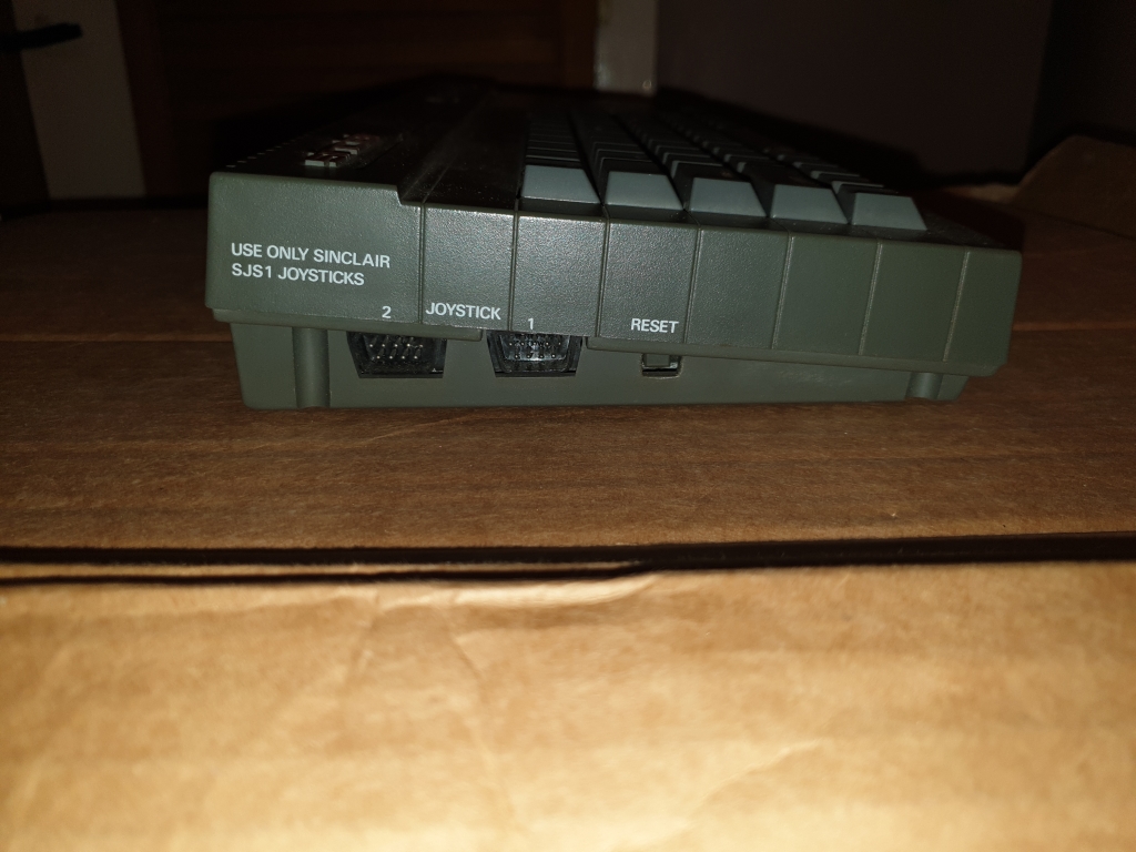 The right side of the machine is empty, but the left side has a reset button and two joystick ports, these are not Atari compatible. Joysticks of the time had two plugs, a black one and a grey one, the black one was Atari compatible, referred to on the Spectrum as "Kempston", and the grey plug was for the Spectrum +2/3, or the Sinclair joystick interfaces for the earlier models.