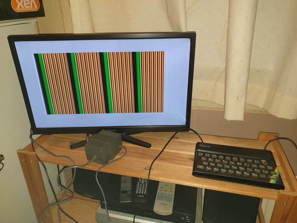 On powering up the machine (using the power pack for my +2, as this one didn't come with a power unit) I was greeted with the above screen and white noise, I think this means a RAM fault, tapping the keys affects the pattern on the screen though, so there is life in the machine