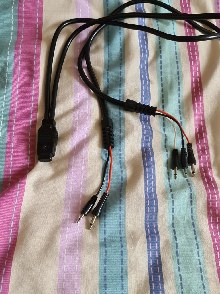 I can only assume this is a fancy cassette lead that plugs into a joystick port, but why it has two sets of plugs, I don't know