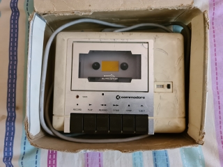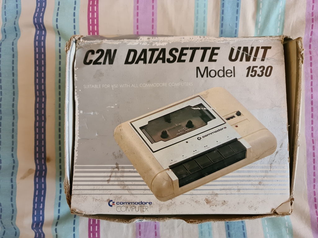 A boxed C2N datasette unit in very poor condition, looks like a cable was wrapped around it and it reacted to the plastic