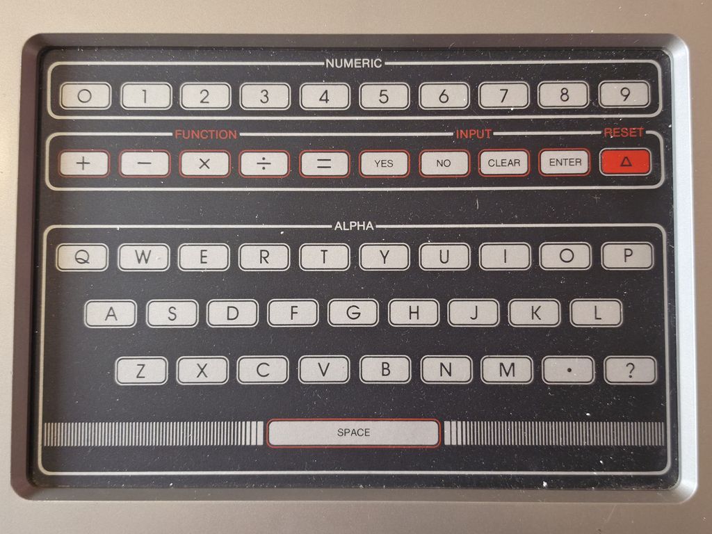Here is the top view with the chiclet keyboard, think ZX81 and you wouldn't be far wrong, the cartridge slot doesn't have a cover