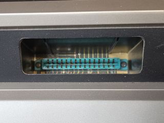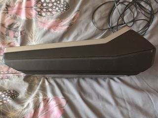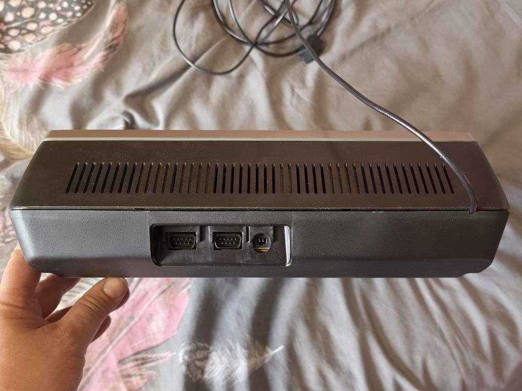 The rear of the computer with the attached RF lead and finally, sockets for controllers and power, the power socket is proprietary, it looks simililar to the Sinclair QL socket albeit with only two pins rather than three