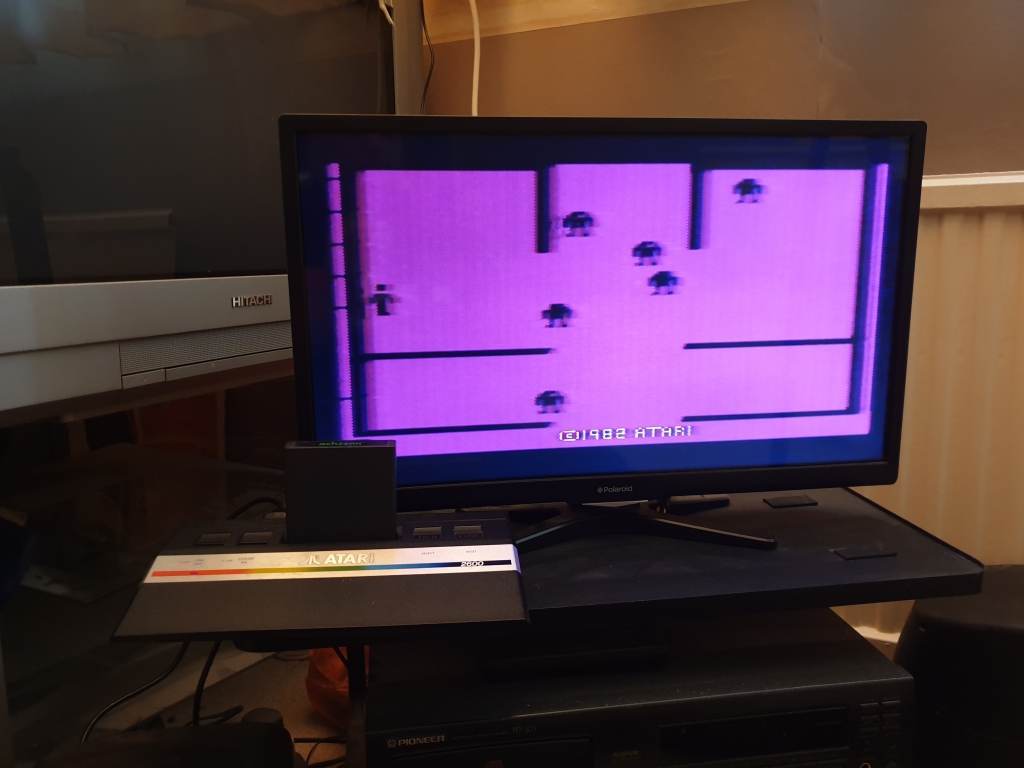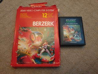 Berzerk (NTSC version)My copy of Berzerk above stopped working. NTSC versions of games work fine on PAL machines, but due to the way software runs on the Atari, the colours are wrong