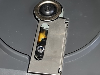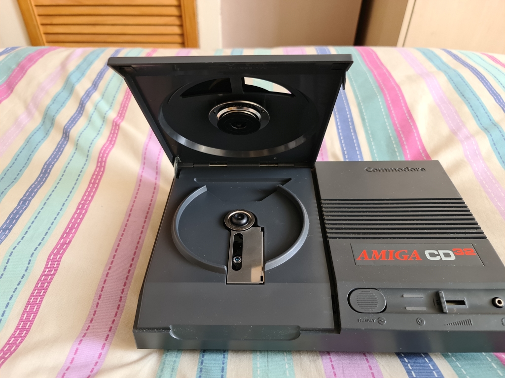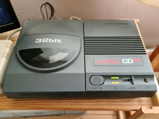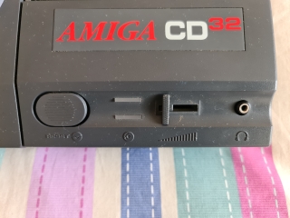 The top of the unit proudly exclaims it's "32bit", and as it's really an Amiga 1200 with an extra chip inside, that's pretty accurate. Operational controls include a reset button, and a volume slider for the headphone output, there is a power LED and a disc access LED as well. The lid just lifts up with a spring to keep it either closed or open, there's no lock or release mechanism