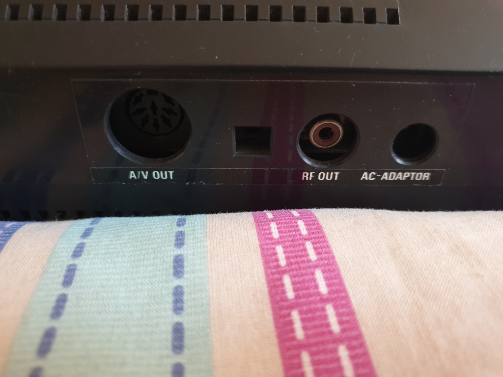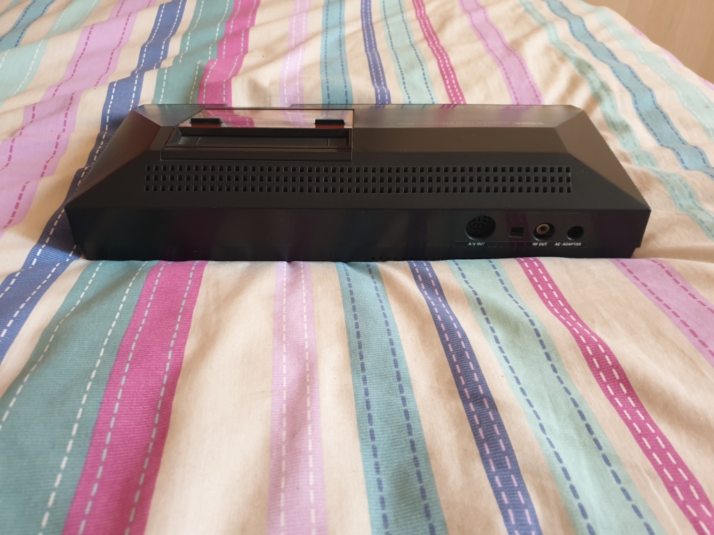 The rear of the machine has the A/V out, RF out, and the AC adaptor sockets, these are all compatible with the first Mega Drive. The hole in the middle was probably for the H-L switch used in some regions