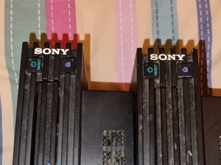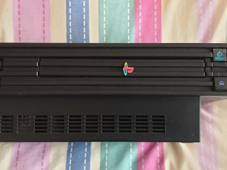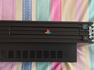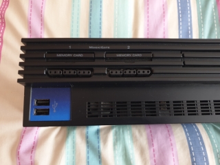 On the front left are two controller ports, these are the same as the original Playstation ports, two memory card slots, and two USB ports, there are some games that allowed the use of USB keyboards and mice. On the right hand side is the disc tray with the power/reset switch, and the disc tray open/close button, in between these buttons is a small IR port for the DVD remote. Yes I know the badge rotates to match the orientation of the console