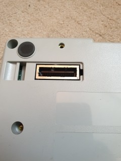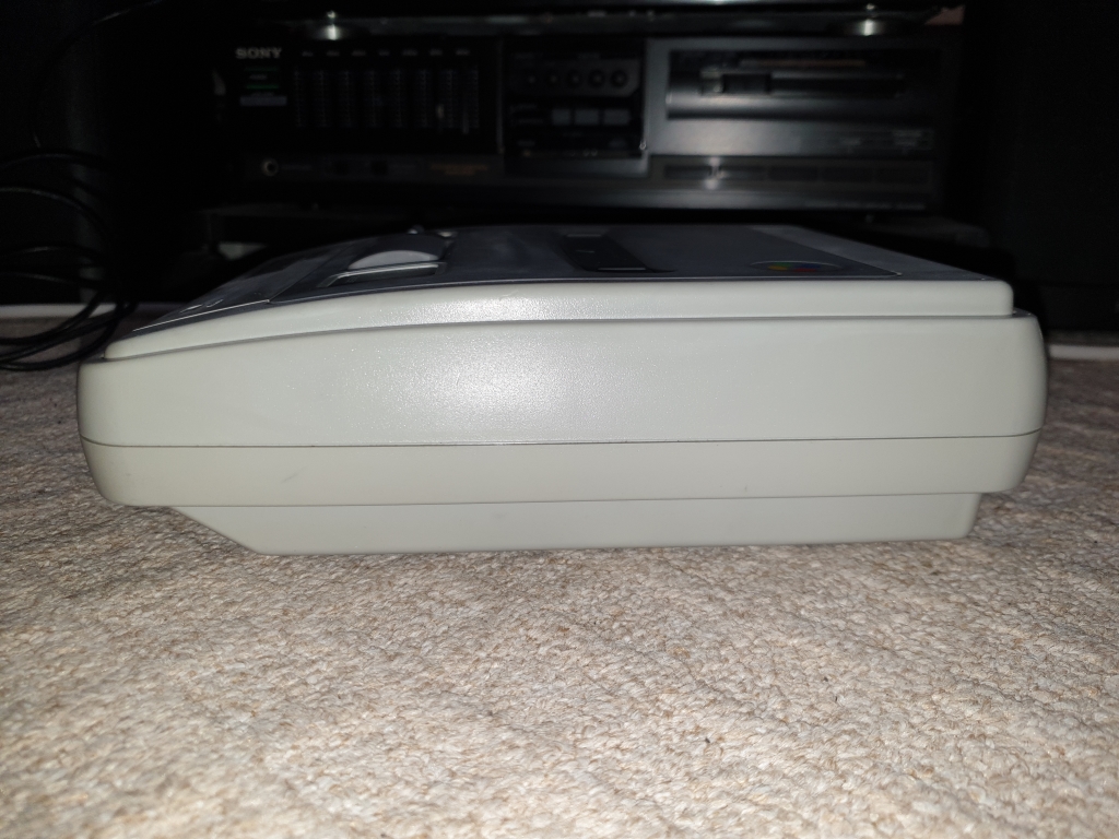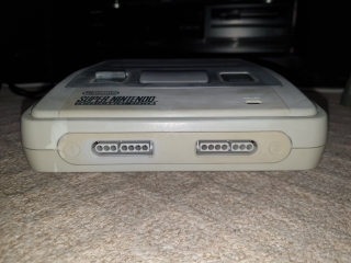 The top of the console has the cartridge slot which is behind a spring loaded door, a toggle power switch with LED, a reset button, and a eject button, this is just a lever that lifts the cartridge up. On the bottom behind a cover is an expansion port. Most notably for the cancelled SNES-CD, which became the PlayStation