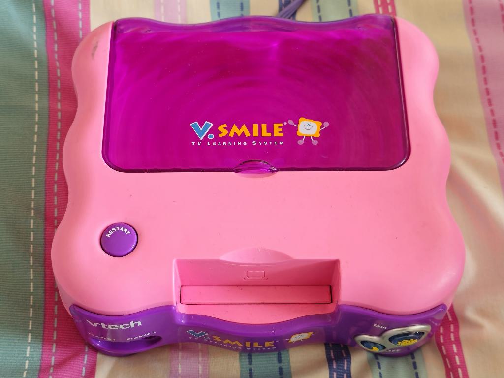 Very similar to the other three VTech Smile consoles, they and the Pocket take the same cartridges. This one is very pink, and apperars to be one of the first generation of VTech V Smile consoles