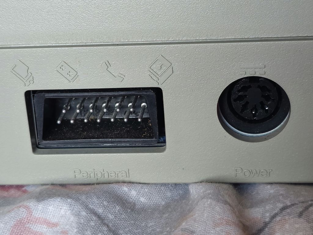 Composite video, audio, and RF output on the left. And the Atari SIO port and power connection on the right. The SIO port can connect to many different devices and can be daisy chained to connect several devices at the same time, examples are printers, disk drives, and modems
