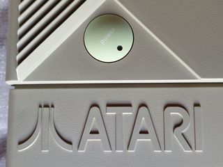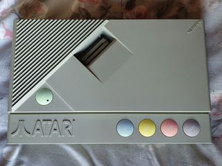 You get a large embossed ATARI logo, a power button with indicator, the normal Atari Start, Select, Option, and Reset buttons, and an unprotected cartridge slot