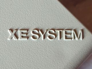 Close-ups of the Atari logo and power button, and embossed XE System branding