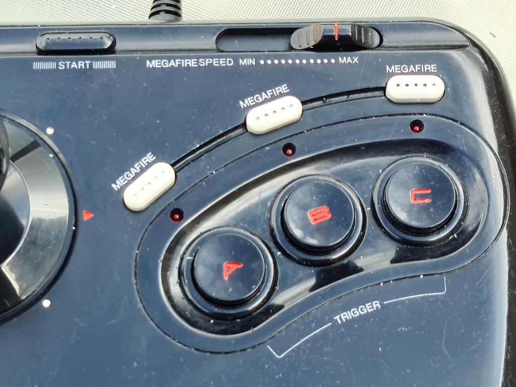 It only has the three ABC buttons, but has a "Megafire" option for all three buttons, with an adjustable rate of fire