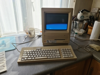 A similar form-factor to previous Macs, this one has the same B&W nine inch CRT with a resolution of 512 x 342, also there are now two drive bays, you can see the SuperDrive, but above that is another bay which contains the 40 MB hard disc. The brightness control is under the CRT on the left