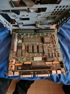 Once you've removed the three connectors (floppy, hard disc, and power/video) the board will slide out and rotate down, the power connector has a clip towards the front of the board which needs squeezing
