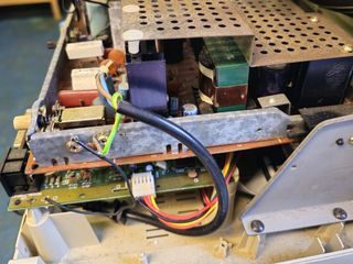 The CRT board is on top and the computer board is below, both have Amstrad printed on them and the cables connecting them are short, so this is about how far the lower board will come out, and I didn't want to screw with it too much so left it alone