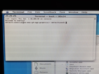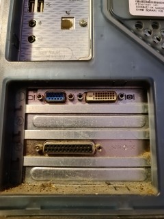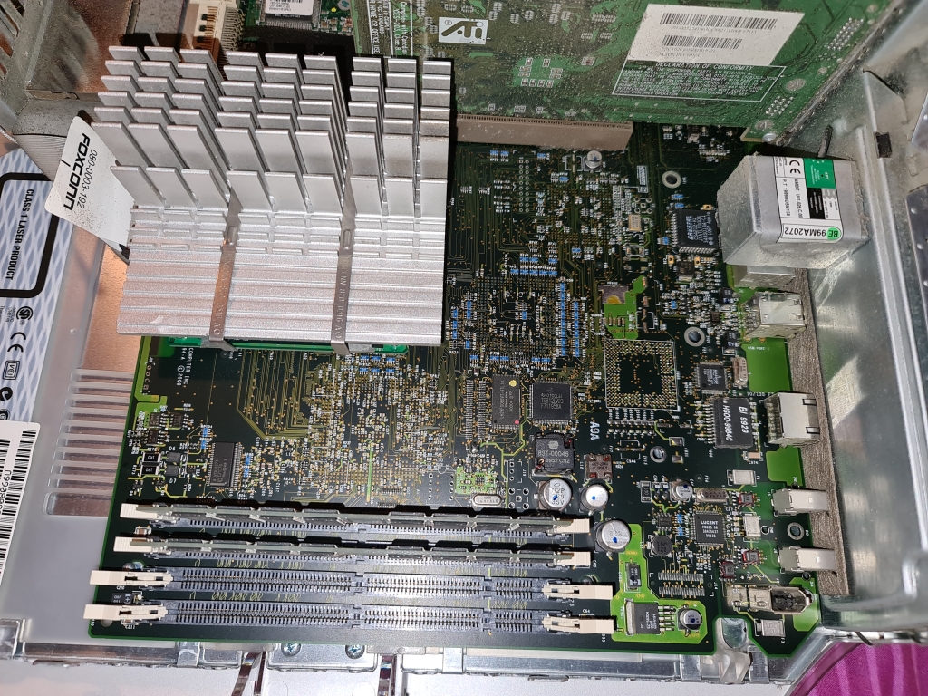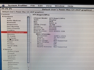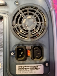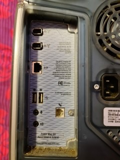 The rear of the machine has two Firewire ports (there is an internal Firewire port as well), Ethernet, two USB 1.1, Mic and speakers, and a modem port. Video is handled by VGA and DVI-D. There is the usual power port with a switched outlet for the monitor. There is also a 25 pin dsub connector for serial or parallel, I'm not sure which
