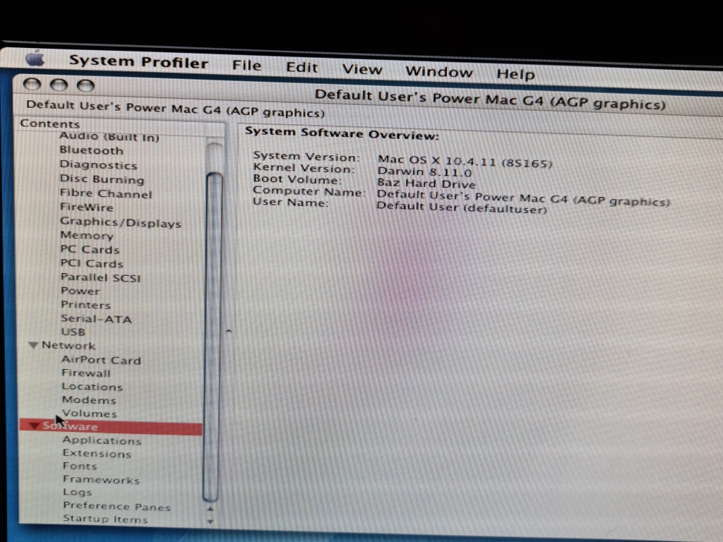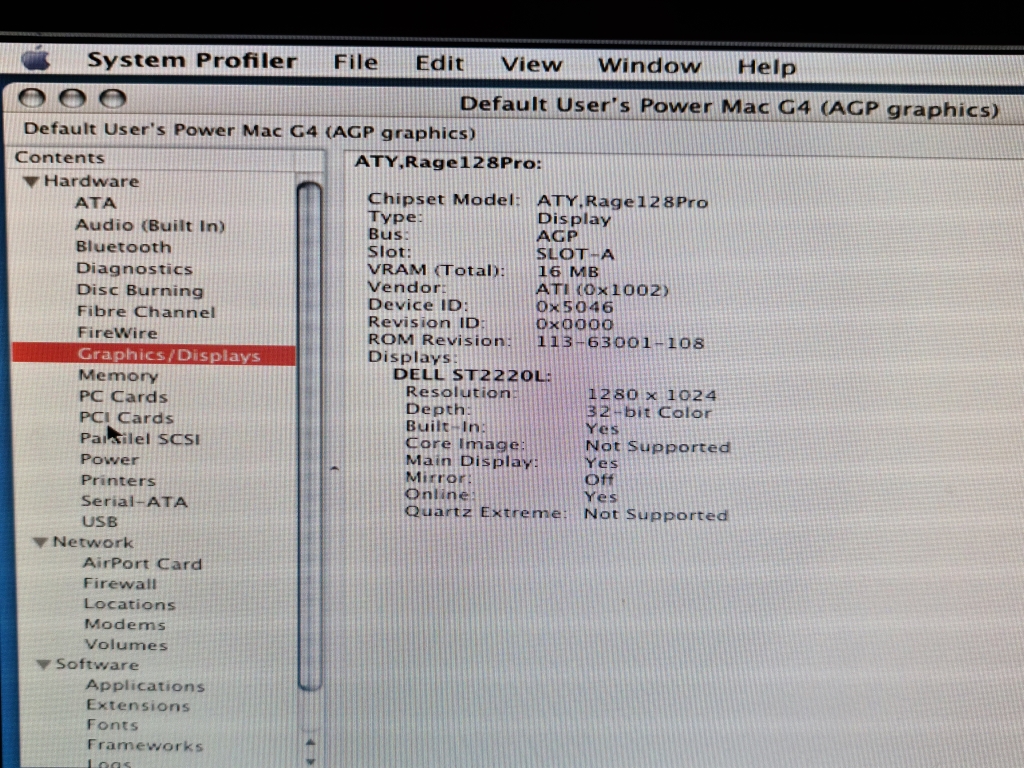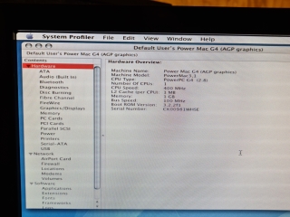 This particular model of the range has AGP graphics, a 400MHz processor, 1Gb RAM, a 10Gb hard disc, and a DVD-ROM drive. OS wise it has 10.4.7 installed