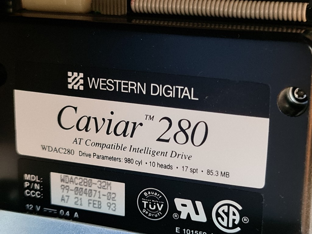 The hard disk, Western Digital WDAC280, 980 Cyl, 10 heads, 17 spt, 85.3MB, it still works