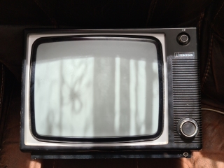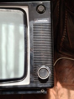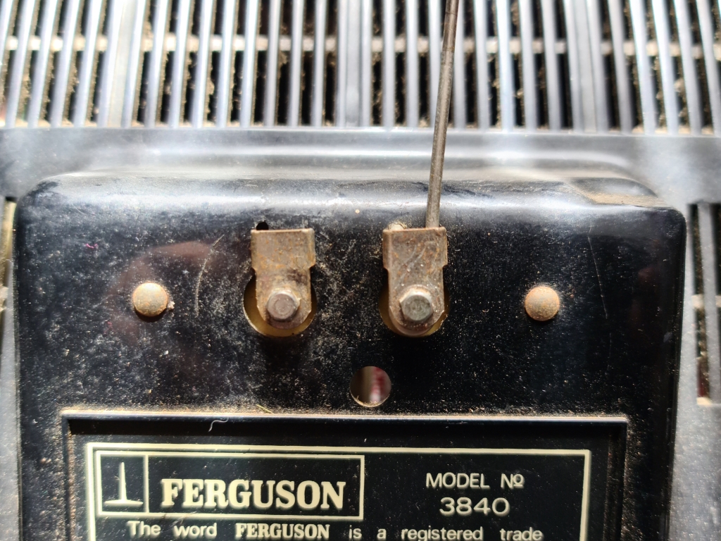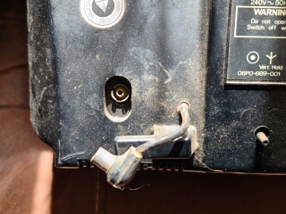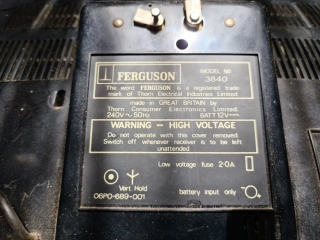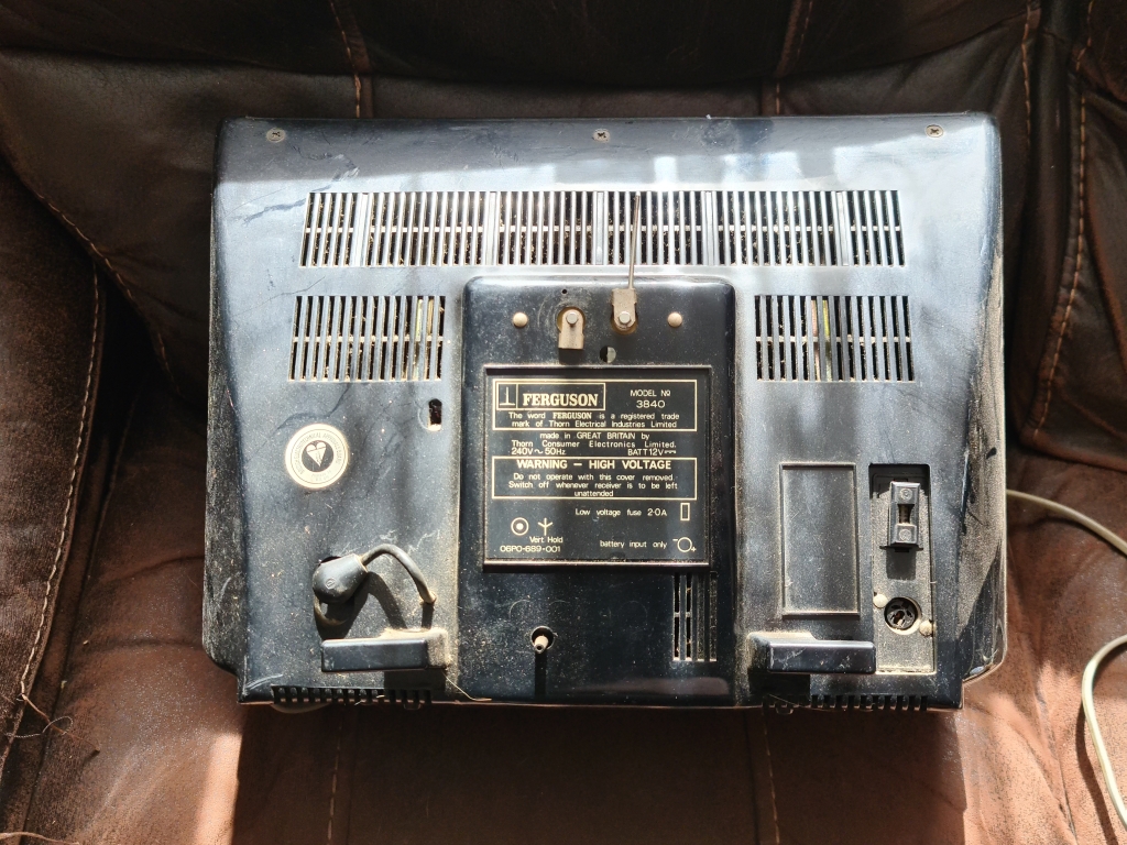 The back of the TV, on the left there is an aerial socket with integrated loop antenna which is not fitted, but any aerial from a later 14 inch portable can be made to fit, there is a fuse and 12Vdc socket on the right side, and finally a vertical hold control under the label