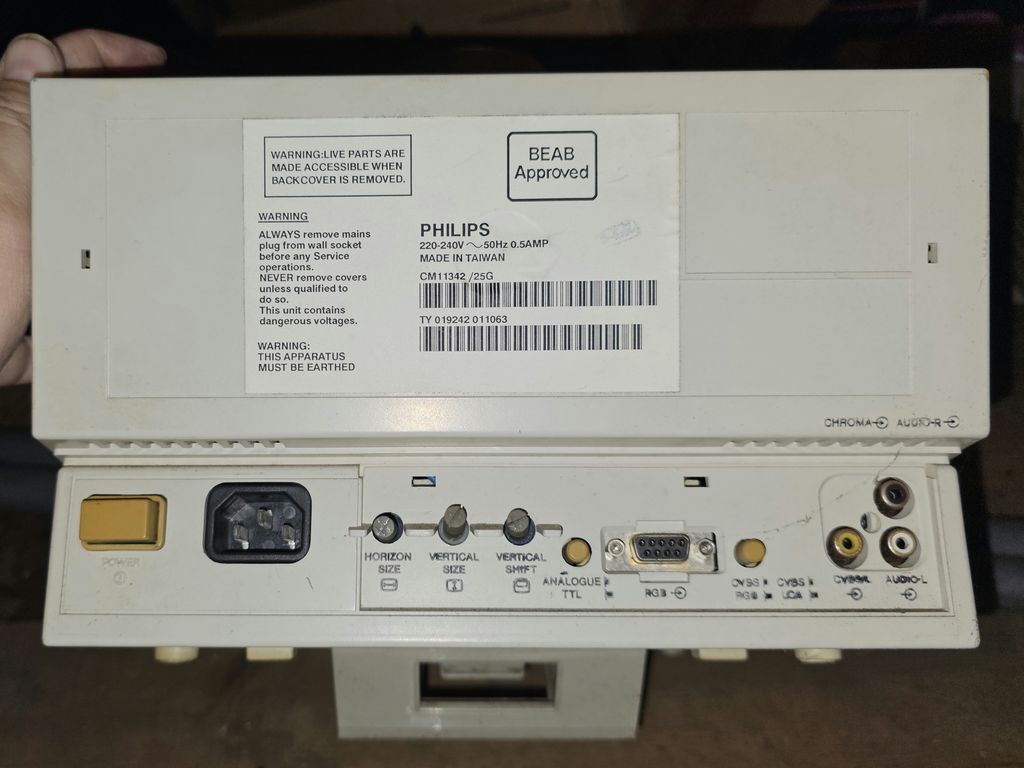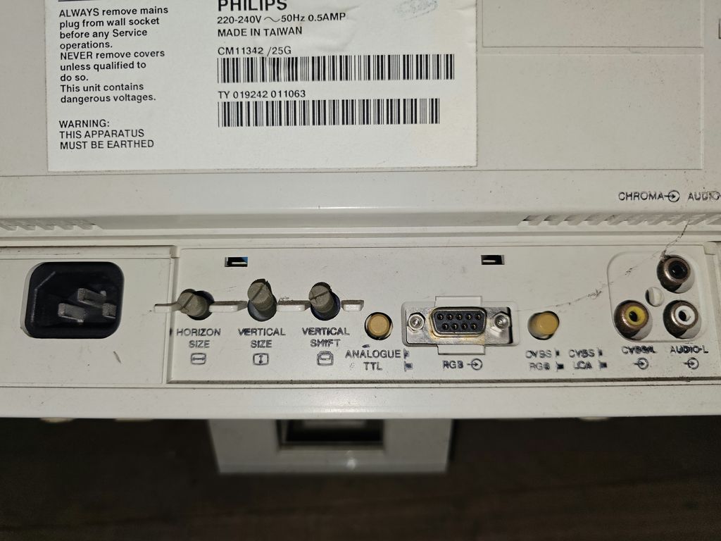The rear of the monitor has many controls including the power switch. Vertical size and position, along with horizontal size. Toggle buttons to switch between digital (PC - CGA) and analogue (Amiga) RGB signals, and to swap inputs between RGB and composite video. Finally the inputs for RGB which is a nine pin D-Sub connector, and composite video and stereo audio. The RGB input can take (with a suitable cable) normal RGB SCART for use with the games consoles of the era. I did briefly use this monitor with my Sega Saturn