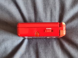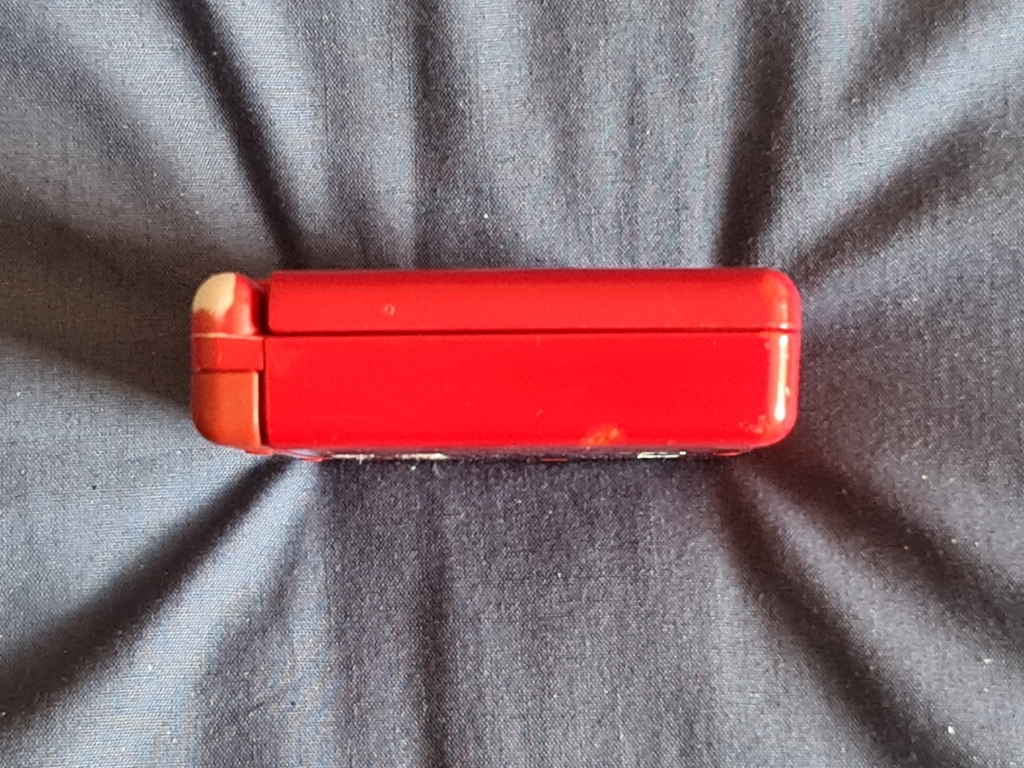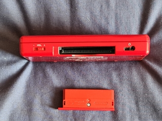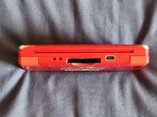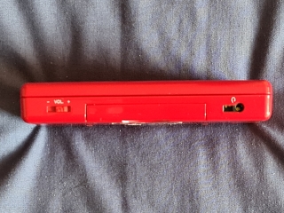 Lanyard holes, DS cartridge slot, and power port on the top, and volume slider, Gameboy Advance cartridge slot, and headphone socket on the bottom