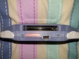 On the bottom there is the power switch, stereo headphone and volume control. On the top are the shoulder buttons, EXT connector used for multiplayer gaming etc, and the cartridge slot
