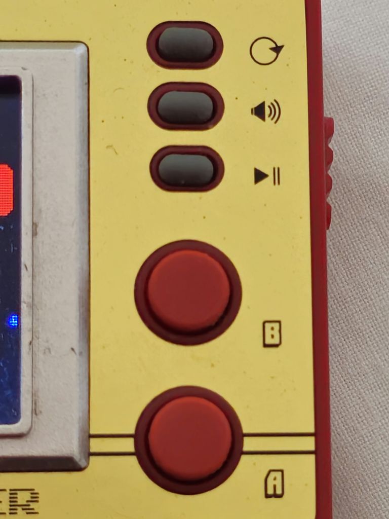 There are four buttons arranged like a D-Pad, and two action buttons labelled B and A. There are also three small device option buttons, reset, volume, and play/pause. There is a power switch on the side as well