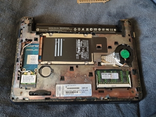 Here you can see the battery and vanity cover removed, here you have access to the hard disc, RAM module, and wifi card