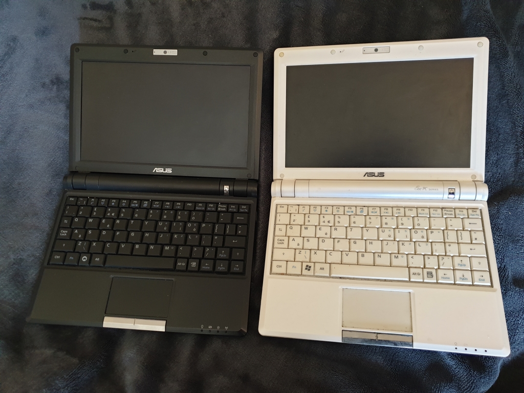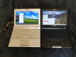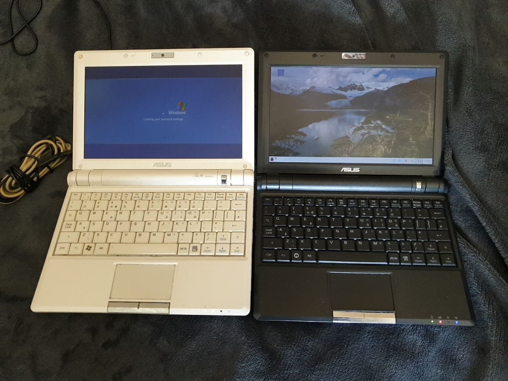 The white netbook originally came with Windows XP, and the black one came with a custom version of Linux, which had a custom menu system rather than a desk top, but the desktop could be "unlocked"