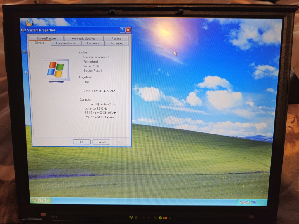 It has Windows XP SP3 with an Intel Pentium M at 1.60GHz and 1GB of RAM