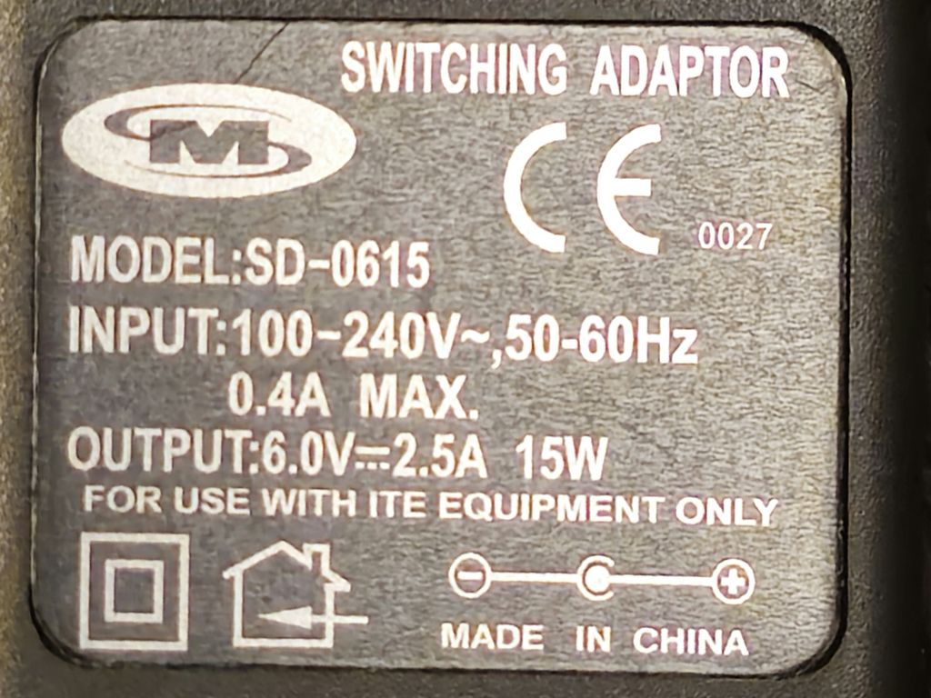 6.0 volts at 2.5 amps, centre positive, although the box itself claims to only need 1 amp