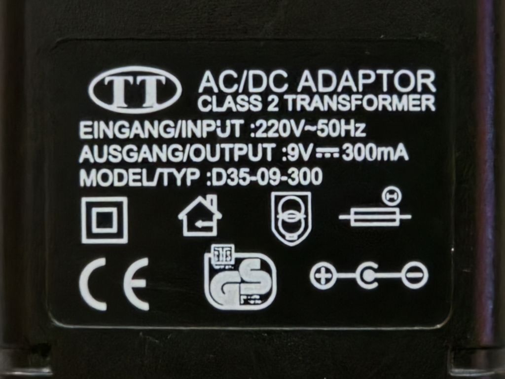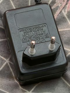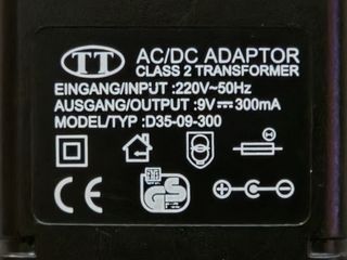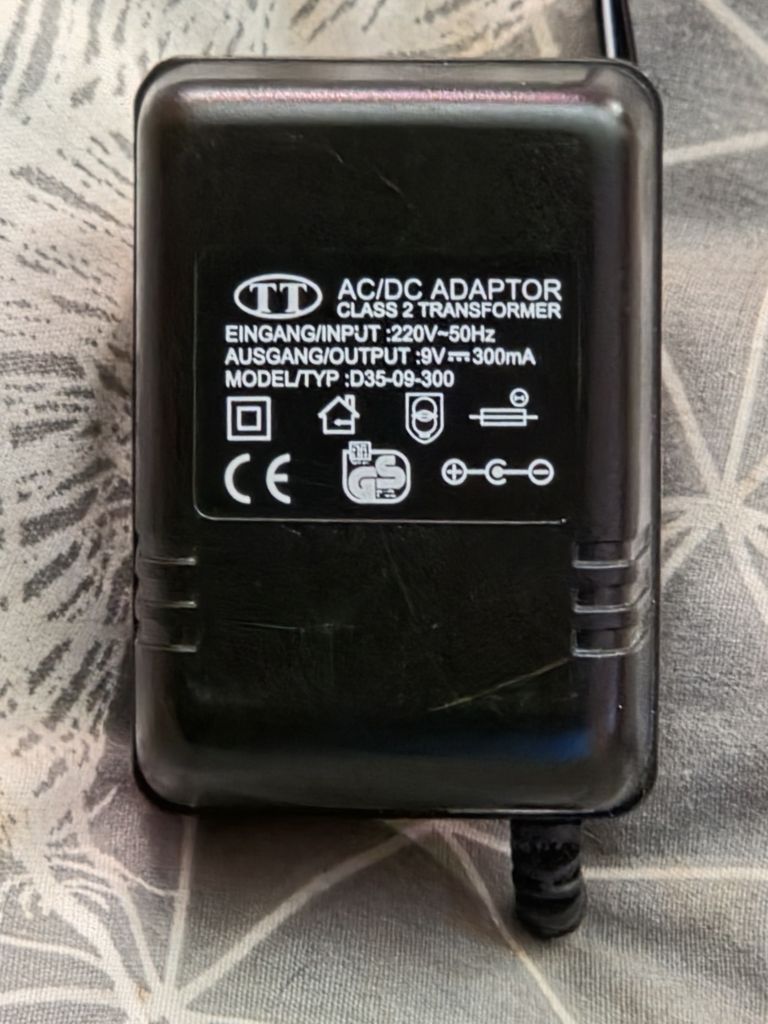 The power supply with Euro plug, luckily I had an adaptor handy, it looks like a ZX Spectrum power supply would work