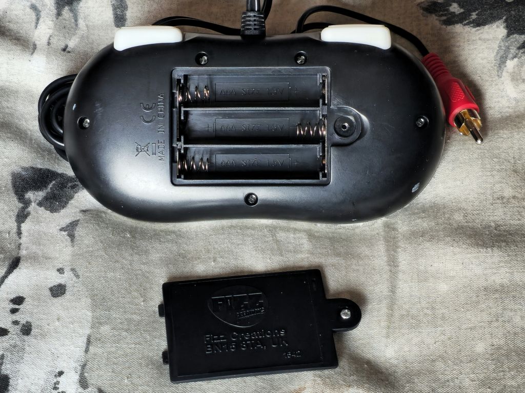 The console takes three AAA's, and you only get composite video and mono audio, but the battery cover has a captive screw