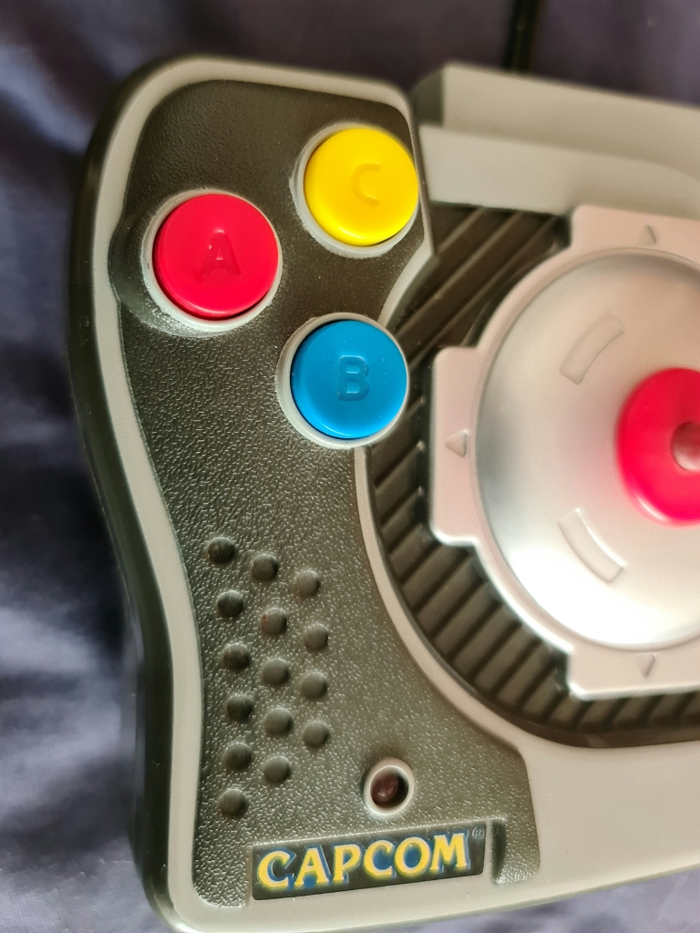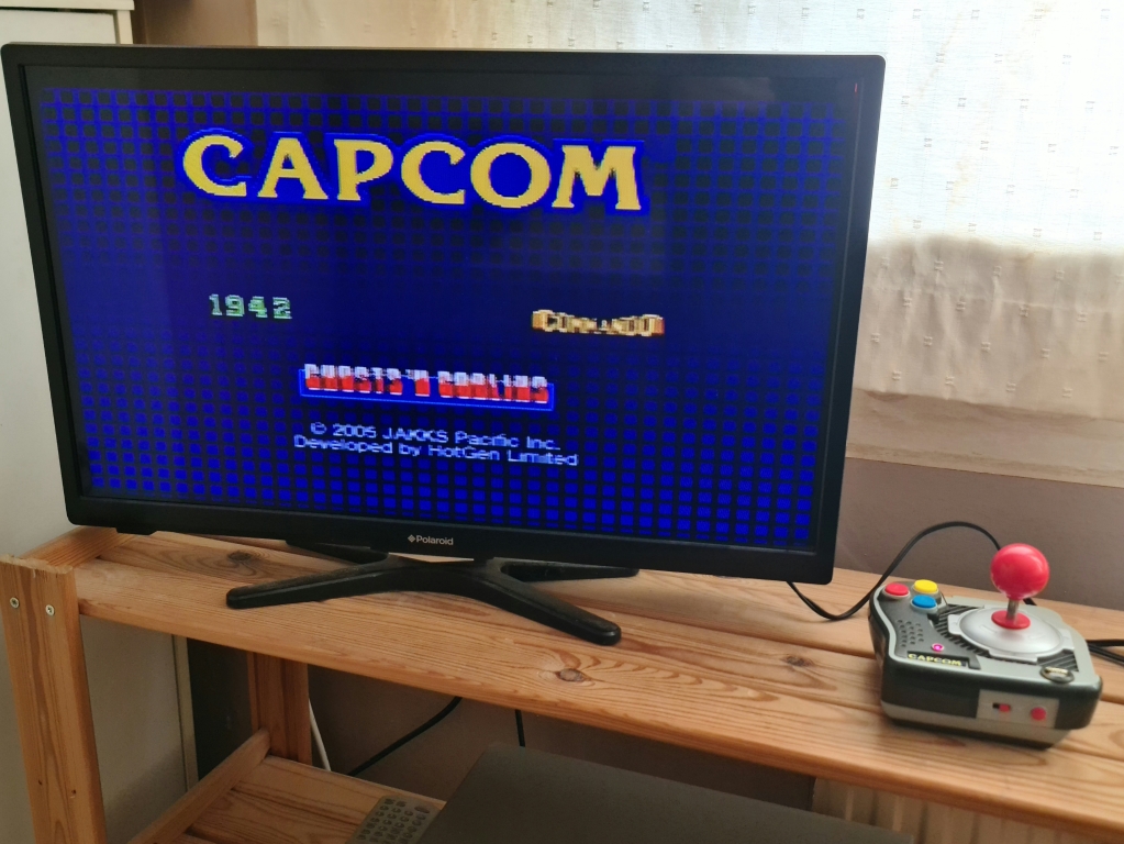 Made by Jakks Pacific, this contains three Capcom games, 1942, Commando, and Ghosts and Goblins. However, this can accept other games by way of a "Game Key"