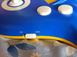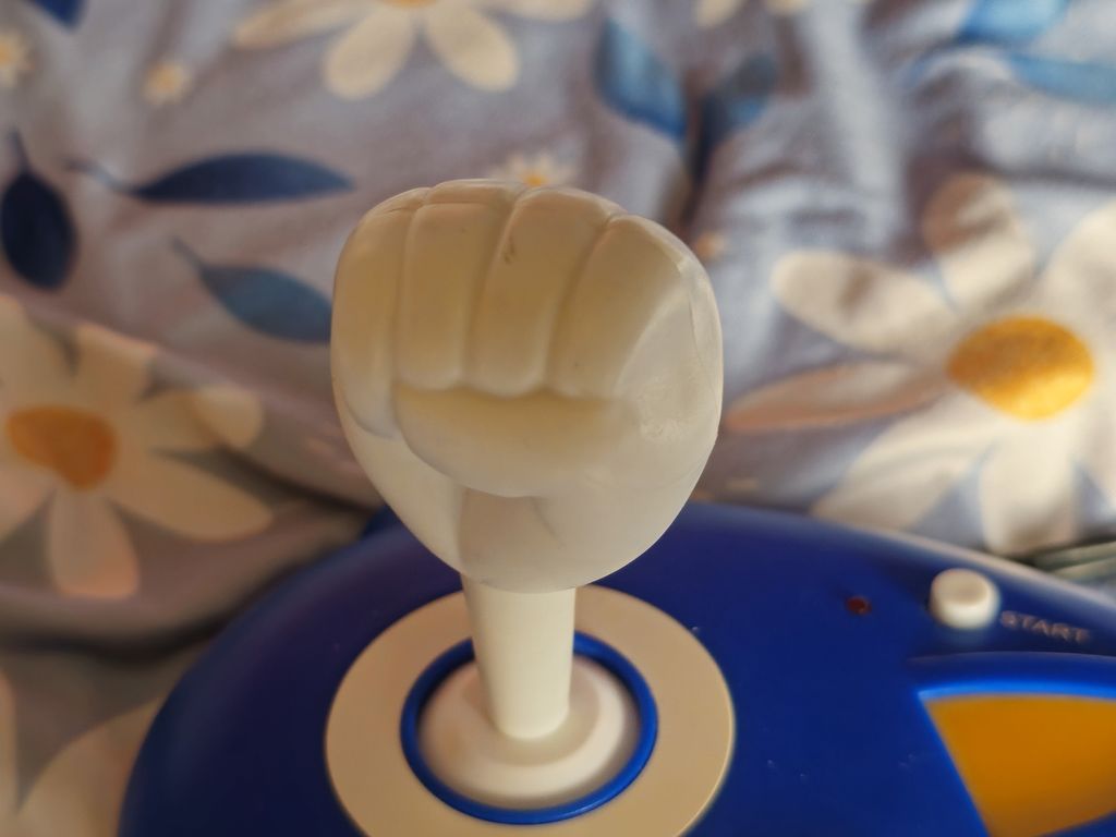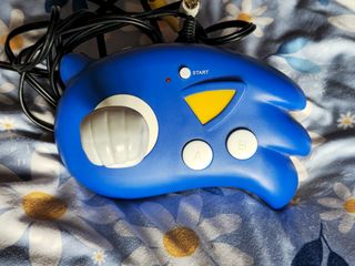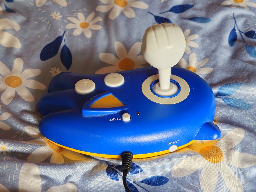 The console itself has a stick which is shaped like Sonic's fist, two action buttons, a Start button, a Reset button, and a power switch with LED.