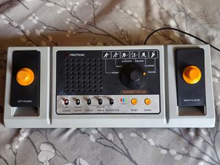 A 51 year old Pong I purchased from Vintage Gamer, this is the oldest exhibit in the museum, it's so old, it's older than me. This is an analogue Pong console which used metal marbles placed in the dimples on top of the console to keep score